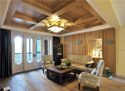 這是一款經典美式田園風格客廳裝修,整個空間采用自然古樸的實木材質打造,原木的家居搭配藍色碎花圖案的布藝沙發,展現出美式田園的舒適與寧靜,吊頂的裝修顯現出空間簡潔明亮的線條,展現主人個性化的生活態度